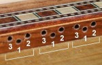 Cách mắc dây đàn Guitar với ngựa đàn 18 lỗ So với ngựa đàn truyền thống 6 lỗ, ngựa đàn 18 lỗ được thiết kế với 2 ưu điểm. Thứ nhất, tạo cho dây góc nghỉ lớn hơn phía sau lưng ngựa đàn giúp cải thiện giai điệu của đàn. |