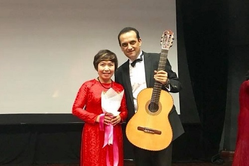 Bùi Lệ Hương, chủ nhân của thương hiệu Swallow Guitars với nghệ sĩ Enrique Munoz