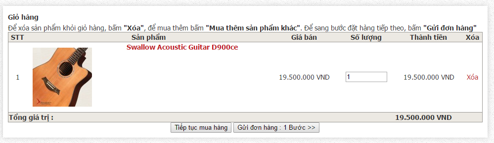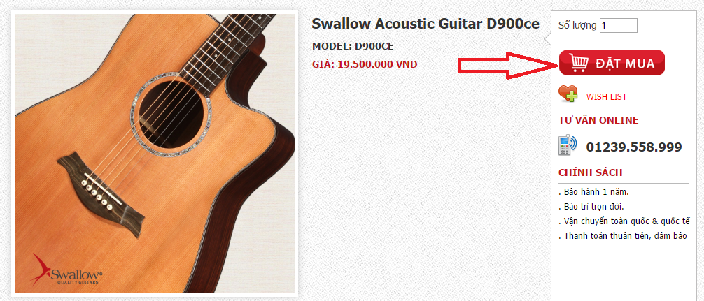 Thật dễ dàng để lựa chọn được một cây đàn ưng ý cho mình trên swallowguitars.com. Sau khi đã lựa chọn được sản phẩm phù hợp, cửa sổ thông tin về sản phẩm sẽ hiện ra, Quý khách click vào nút ĐẶT MUA trên sản phẩm đó.