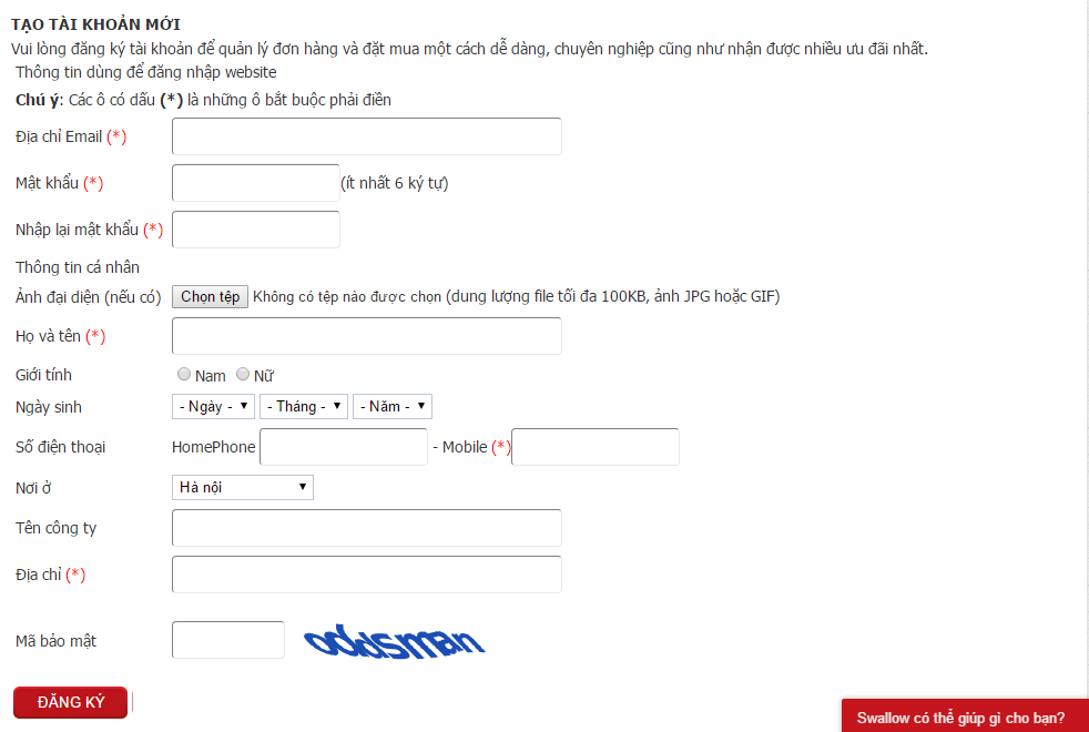 Bảng thông tin đăng ký hiện ra, Quý khách vui lòng nhập đầy đủ thông tin vào bảng "Đăng ký"