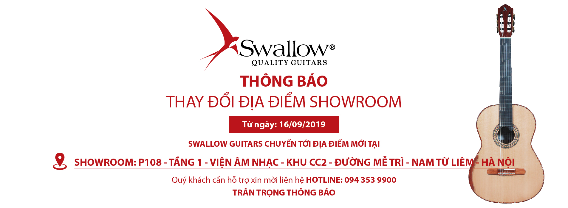 Chúng tôi trân trọng thông báo tới Quý khách từ ngày 16/9/2019, Swallow Guitars chuyển showroom đến địa điểm mới tại P108 - Tầng 1 - Viện Âm Nhạc - Khu CC2 – Đường Mễ Trì – Nam Từ Liêm - Hà Nội.